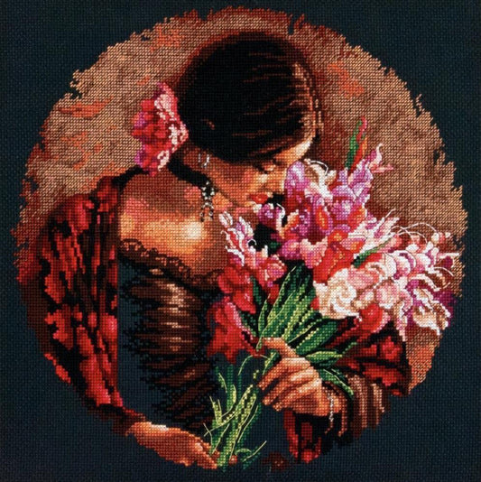 Schema punto croce SAGA PDF + XSD + PK DONNA spagnola con mazzo di fiori SPANISH WOMAN with flowered ross stitch patterns stampabile