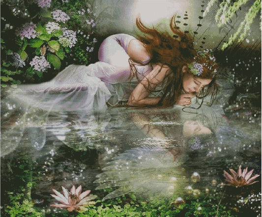 Schema punto croce SAGA PDF + XSD FATA si specchia sul lago woman who reflects in the LAKE cross stitch pattern keeper facile da stampare