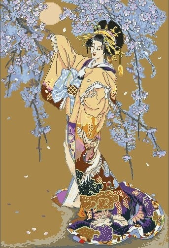 Schema punto croce SAGA PDF + XSD PK GEISHA il PESCO the geisha and the peach tree cross stitch pattern keeper white blossom facile da stampare