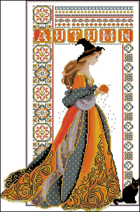 Schema punto croce SAGA PDF + XSD WITCH HALLOWEEN autunno cat cross stitch pumpkin pattern keeper celtic lady night pk facile da stampare